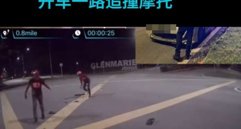事主随后开车追赶约两公里,在匪徒回转弯时,摩托撞上情侣车辆失控翻倒,两名嫌犯趁机逃逸。