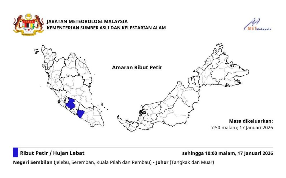 周六晚间仍在外活动的民众请注意安全!大马气象局今晚发布了最新的“雷暴预警”(AMARAN RIBUT PETIR)。预警显示,森美兰中部及柔佛北部局部地区正遭受强雷暴、豪雨及大风袭击。