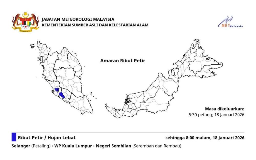 马来西亚气象局(MetMalaysia)于今日傍晚 5时30分 发布雷雨警报,预计 雪兰莪、吉隆坡及森美兰部分地区 将出现雷雨及强降雨天气,警报有效至今晚8时