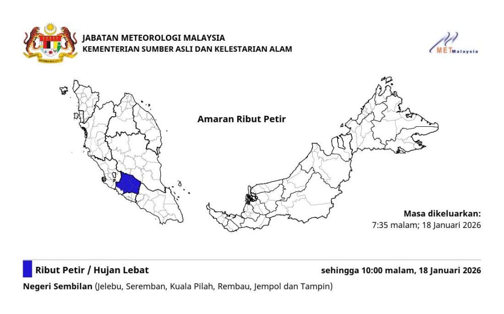 马来西亚气象局(MetMalaysia)于1月18日晚间7:35发布雷暴警告,预计雪兰莪州部分地区将出现雷暴、强降雨及大风,持续至当晚10点。受影响的地区包括:Jelebu、Seremban、Kuala Pilah、Rembau、Jempol 及 Tampin。