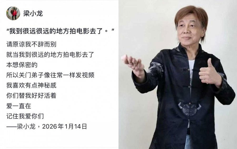 香港影星梁小龙于1月14日逝世,享年77岁。他的抖音账号在晚间无预警更新,留言称希望粉丝原谅他“悄然离去”,并叮嘱大家“替我好好活着,记住我爱你们”。