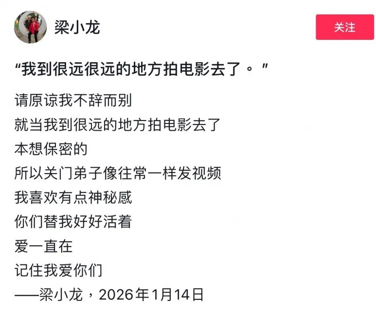 梁小龙在最后的留言中深情叮嘱粉丝:“替我好好活着,爱一直在。”留言署名及日期为2026年1月14日,似乎是他生前的最后文字。