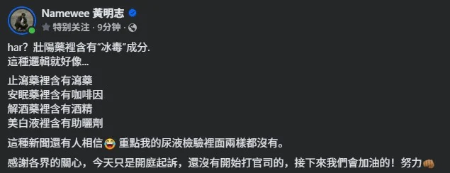 对此,黄明志随后作出回应,强调其尿液检测结果并未验出冰毒或西地那非成分,并对有关指控提出质疑。他形容,有关说法在逻辑上难以成立。