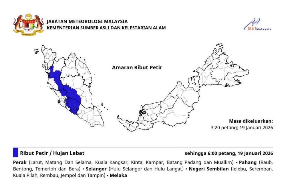 马来西亚气象部门发布雷暴警报,预计今日(1月19日)下午,多州将出现雷暴、强降雨及狂风天气,受影响地区包括: