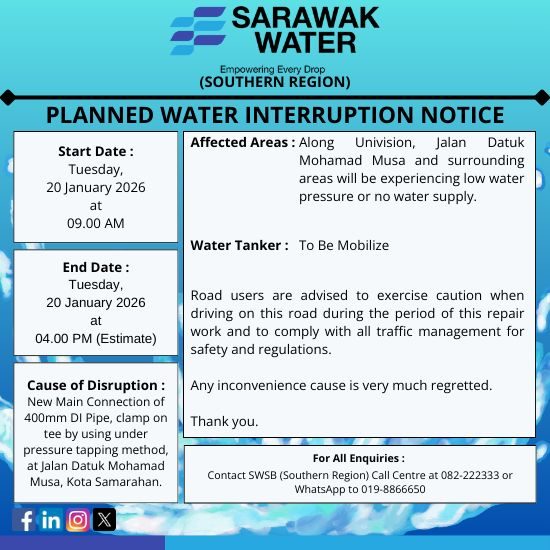 Univision 一带、Datuk Mohamad Musa 路及周边地区,可能出现水压偏低或暂时无水供应的情况。
