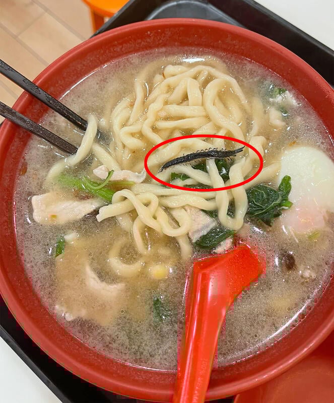 食客邱女士(43岁)向《新明日报》表示,她上周三(14日)傍晚约7时,带着10岁及8岁的孩子到利达广场面店用餐,为孩子点了一碗售价5元5角(约17令吉)的板面。她说:“正准备把板面分成两小碗时,捞起面条才发现汤里有异物。”