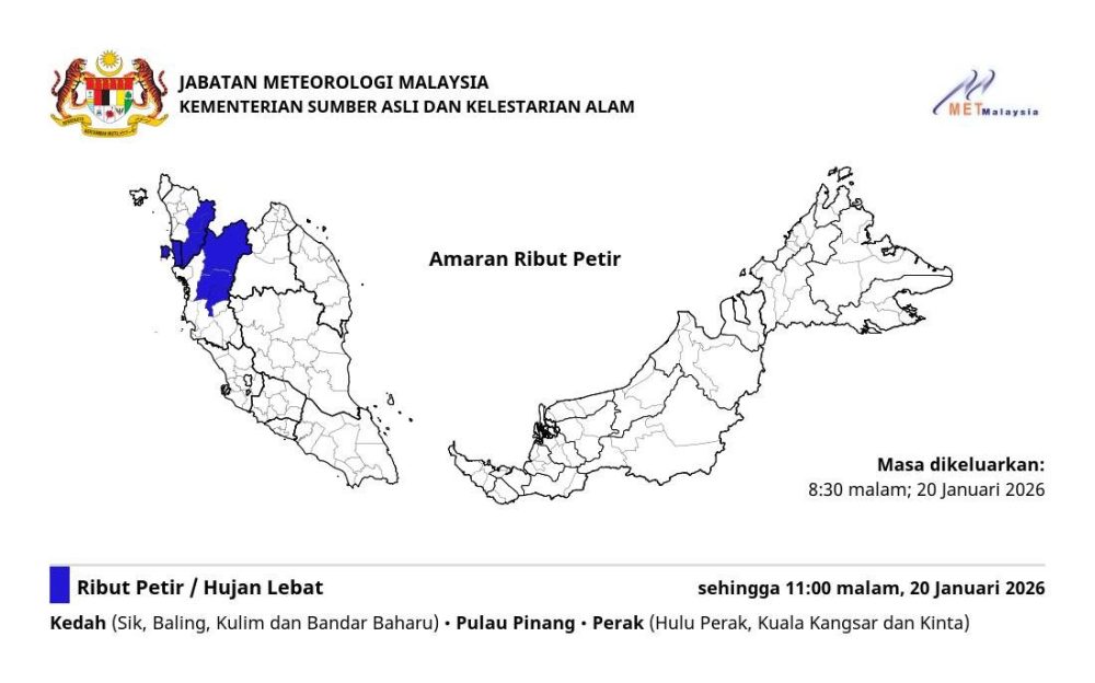 马来西亚气象局今晚发出雷暴警报,预计吉打、槟城及霹雳部分地区将出现雷暴、强降雨及狂风天气,警报有效至今晚11时。
