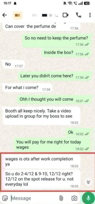 受害女事主蔡佩颖在面子书发文表示,她在某大学校园市集的香水摊兼职销售6天,事先约定薪资为底薪加佣金共865令吉,并承诺在最后工作日结清。然而,摊主当天未现身,仅透过讯息指示她收好货品,并称稍后会转账支付薪资,结果一拖就是一个月。