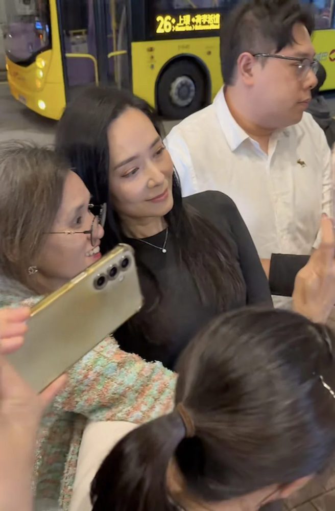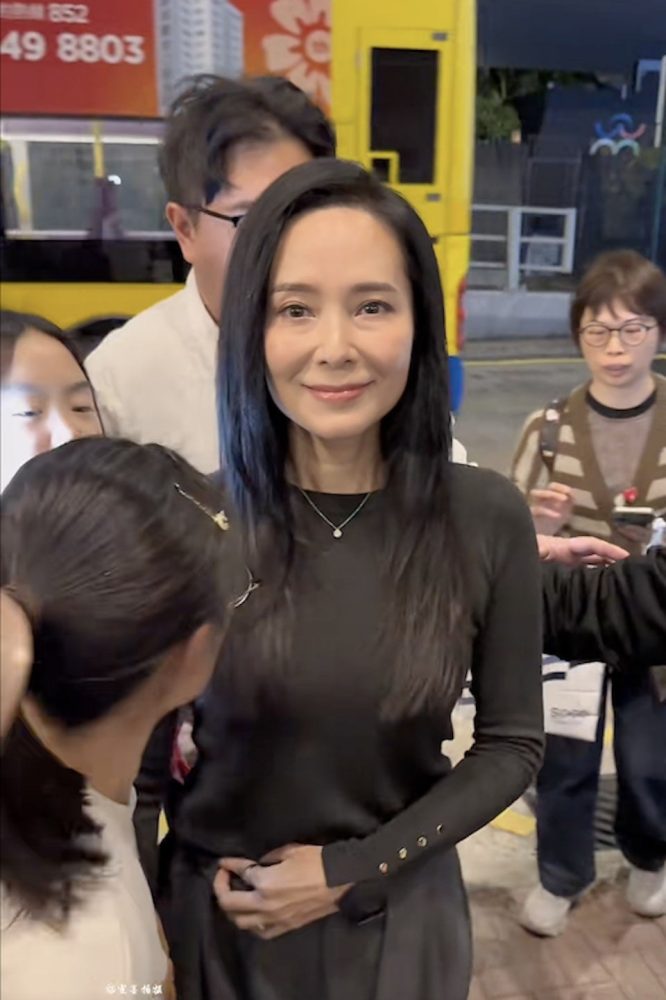 当天,郭羡妮身穿黑色上衣搭配黑色长裤亮相,一登场便吸引大批粉丝围观。她面带微笑、轻轻挥手回应粉丝热情,虽然略显腼腆,但始终保持优雅姿态,耐心配合合照,举止大方得体,尽显昔日港姐风范。
