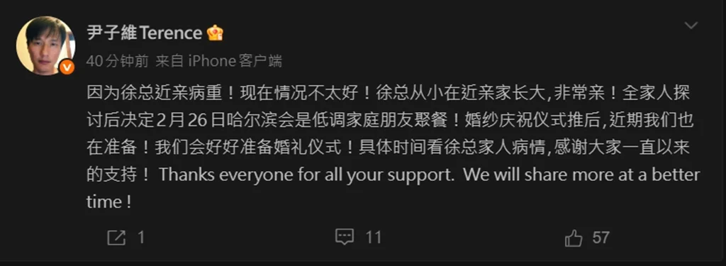 尹子维在微博发文表示:“因徐总近亲病重,目前情况不太好。徐总自小在亲人家长大,与家人感情深厚。全家商议后决定,2月26日在哈尔滨举行的是低调的家庭朋友聚餐,婚纱庆祝仪式将另行安排。我们会好好准备婚礼,具体时间视徐总家人病情而定。感谢大家一直以来的支持。”