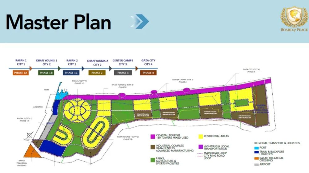 这份被称为“总体规划”的文件详细描绘了未来的加沙面貌,其中包括沿海建立包含180栋高楼的观光特区,并配套建设数据中心、科技园区以及完善的农工设施。根据规划,重建工程将划分为四个阶段,首阶段锁定南部城市拉法,随后逐步向北延伸至加沙城。此外,靠近埃及边境的区域将兴建全新的海港与机场,而埃以交界处则会设立三方过境点,全面打通该区的对外交通。
