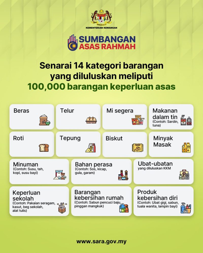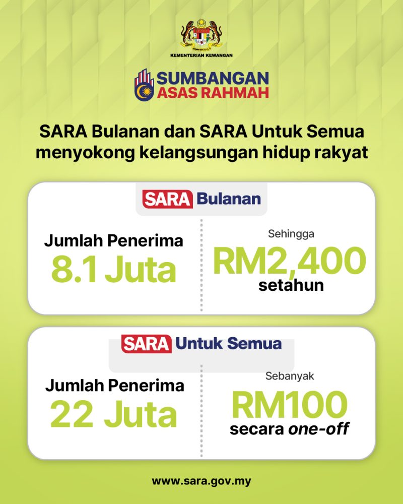 政府宣布将于2月9日正式发放名为“SARA Untuk Semua”的一次性慈悯基本援助金,预计全马将有2200万名符合资格的国民受惠。