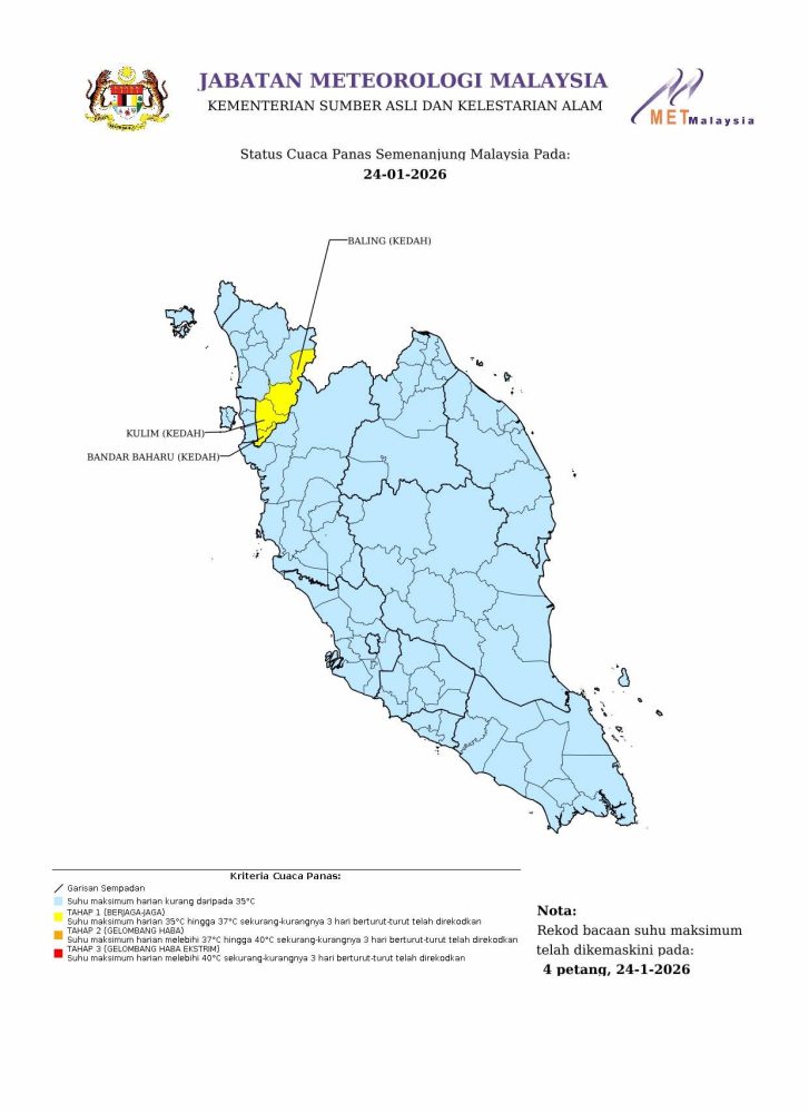 大马气象局(MetMalaysia)(24日)发布最新气象预警,由于吉打州(Kedah)部分地区气温持续攀升,官方已针对3个重点区域发出一级(黄色)酷热天气警示