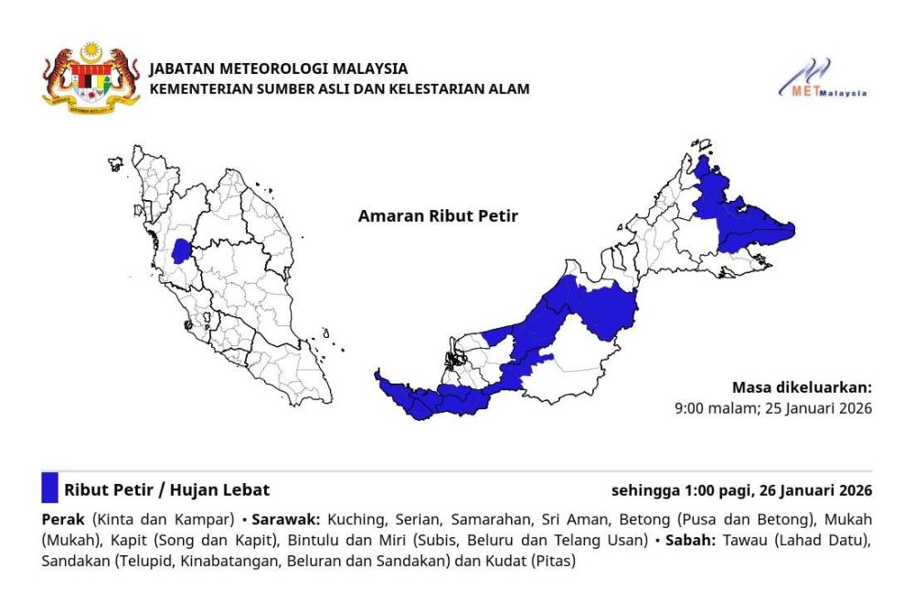 马来西亚气象局提醒,霹雳、砂拉越及沙巴部分地区将出现雷暴、大雨及强风天气,市民需提高警惕。