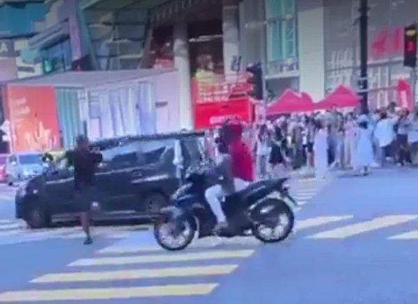 社交媒体上流传的一段惊险视频显示,该名男子神情狂乱,在武吉免登繁忙路段的斑马线上横冲直撞。画面显示,他手中疑似握有一把武士刀,但由于拍摄距离及画面模糊,其具体持有的武器类型仍有待警方最终核实。