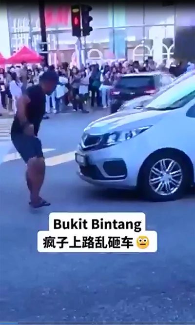 隆市著名旅游胜地武吉免登(Bukit Bintang)惊传“疯汉”持械大闹街头!一名疑似患有精神疾病的男子在众目睽睽之下,随机攻击路过的车辆与骑士,引起路人恐慌。