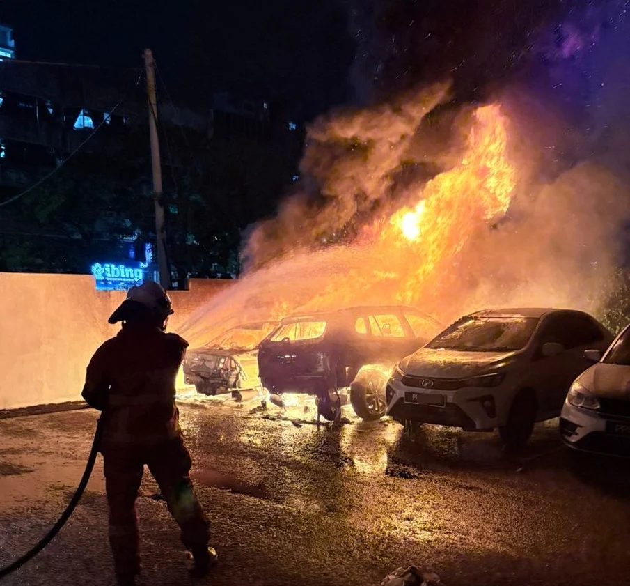 槟城峇六拜(Bayan Lepas)一栋高级公寓今日凌晨惊传严重火灾!位于Tunas Residensi公寓的户内外停车场突然起火,火势凶猛,导致共计9辆交通工具瞬间陷入火海,现场损失惨重。