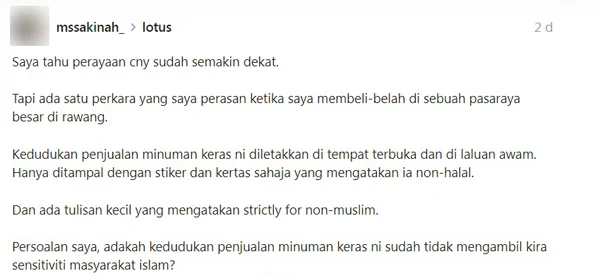 农历新年将至,雪州万挠(Rawang)一家大型霸级市场因在显眼位置陈列啤酒,意外掀起一场关于“宗教敏感度”与“多元文化”的网战。一名巫裔女子在社交媒体 Threads 发文质疑商家此举是否顾及穆斯林感受,目前该帖文已吸引约 20万次 浏览。