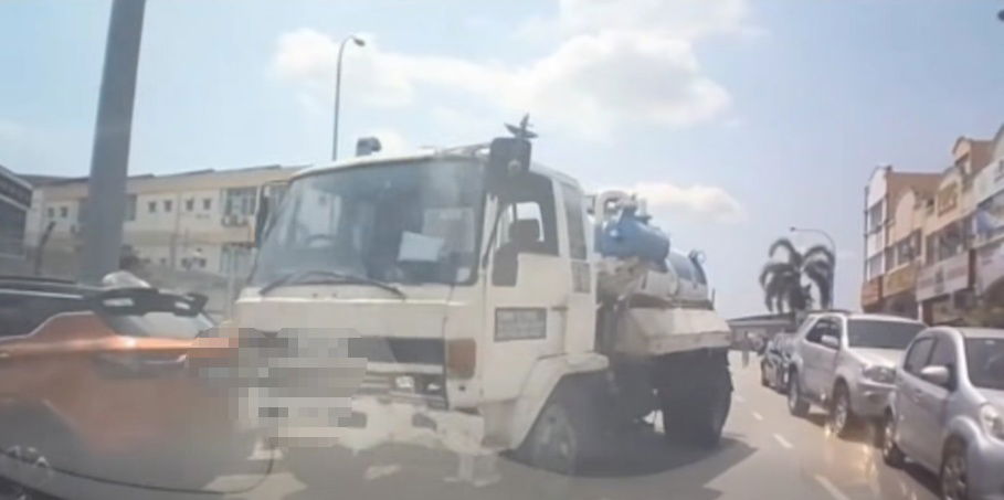 惊险瞬间!蕉赖首都镇(Bandar Damai Perdana)今日中午发生一宗离奇连环撞车祸。一辆大型槽罐罗里疑在停车时未拉上手刹,导致车辆在无人驾驶的情况下顺着斜坡滑行,径直冲向闹市街道,连撞沿途5辆轿车!