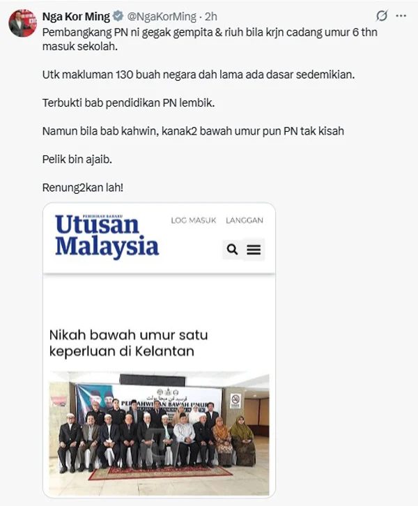 倪可敏在帖文中上载了一张《马来西亚前锋报》2018年的新闻截图,标题为《在吉兰丹,未成年婚姻是一种需求》,借此讽刺国盟(特别是伊党):“当提到6岁念书时,他们反应强烈;但到了结婚课题,他们对未成年儿童结婚却完全不在意。这真是奇怪至极。”他暗示国盟宁可让儿童早婚,也不愿让儿童早点接受正规教育。