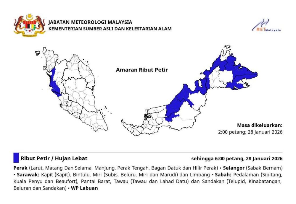 预计马来西亚以下地区将出现雷暴、大雨及强风,天气情况预计将持续至 2026 年 1 月 28 日(星期三)傍晚 6:00