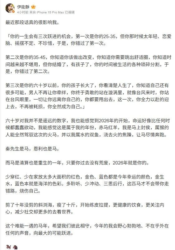 年近耳顺之年的女星伊能静,近日在微博投下一枚“励志炸弹”!27日,她感性分享近期的生活体悟,自曝为了迎接2026年的全新挑战,不仅剪掉了留了十年的长刘海,更凭借惊人毅力狂瘦6公斤,状态重回巅峰。