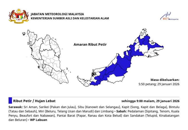 大马气象局于周三傍晚发布雷暴警报,预计砂拉越、沙巴及纳闽多地将出现雷雨及强降雨天气,警报生效至今晚9时。