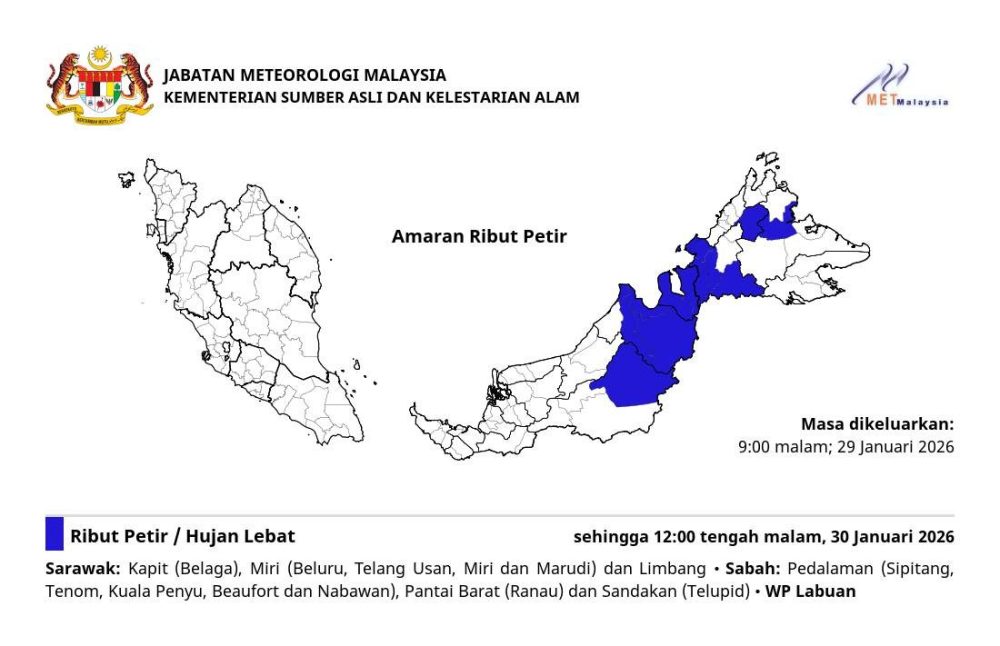 气象局于今日晚上9时发布紧急气象预警,由于国内多地对流活动活跃,东马及纳闽局部地区将迎来强降雨与狂风,预计恶劣天气将持续影响至周五(1月30日)凌晨12时。