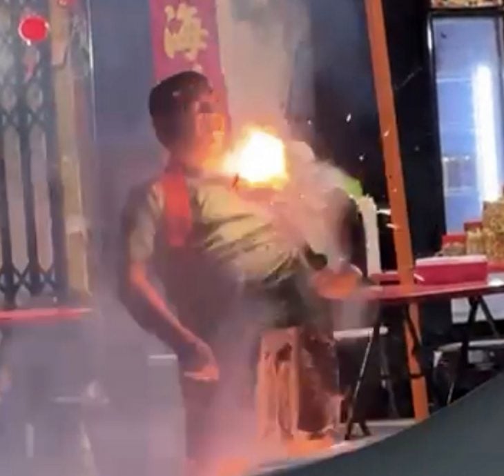 根据《星洲日报》报导,这起大胆的宣传事件发生于马六甲峇章三角路。现年42岁的主角曾玟畯,平时在当地经营生肉面生意,适逢农历新年将至,便在店外搭棚售卖年货烟花。昨晚他为了在竞争激烈的市场中脱颖而出,突发奇想亲自上阵,表演了一场“红炮缠身”的戏码。