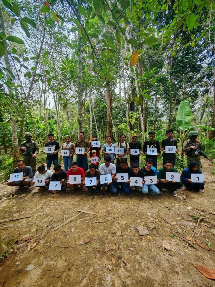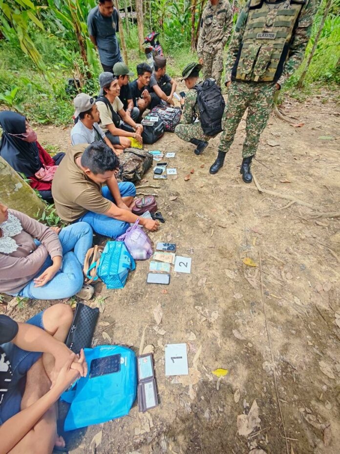 2026 年 1 月 28 日下午 3 时 20 分,正在伦乐边防巡逻的陆军人员发现多名可疑人士正从印尼边境向大马境内移动。值班小组立即采取行动,在距离马印边境线约 800 米的大马领土范围内展开战术突袭,成功截获 17 名男性及 4 名女性。
