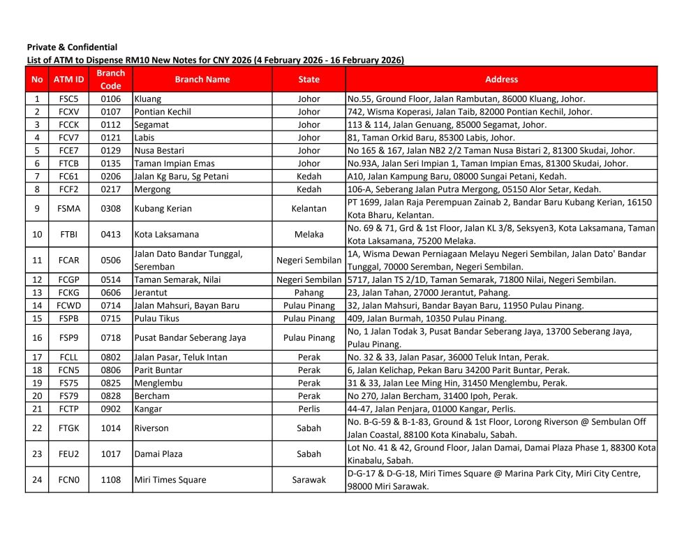 根据该银行发布的最新通告,这项服务将从2026年2月4日(周三)开始,一直持续至2月16日(周一)。届时,民众可前往全国41个指定地点的ATM提取崭新钞票。