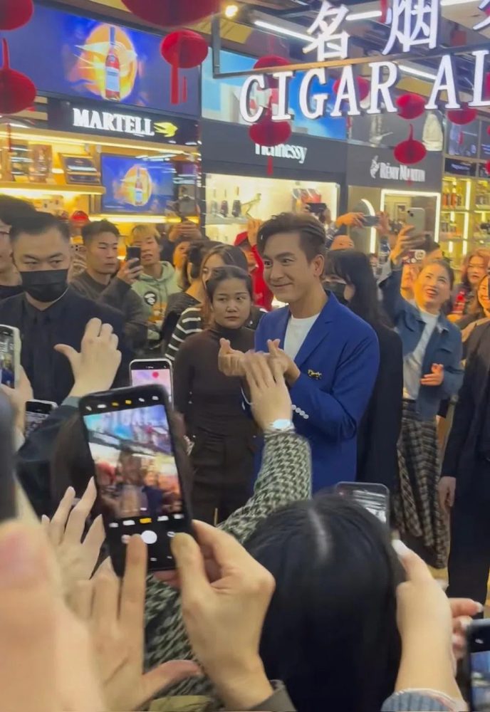 当天,马国明身穿笔挺蓝色西装帅气亮相,一登场便引爆全场尖叫。面对人山人海的簇拥,他尽显亲民本色,全程开启“全天候微笑模式”,不仅频频向路人挥手致意,步入商场时更应要求对着镜头大摆“比心”Pose。最逗趣的是,这个可爱的定格动作足足维持了好几秒,反差萌的表现瞬间融化不少粉丝的心。