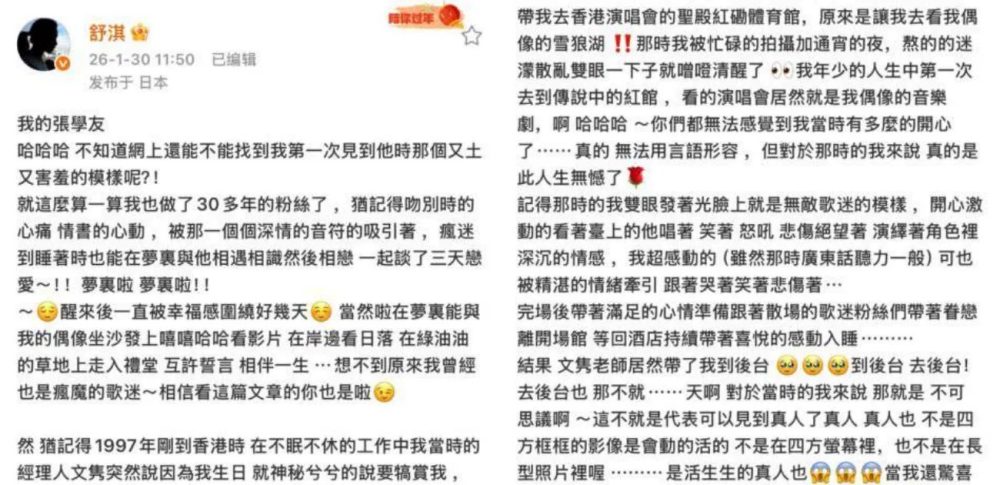 在这篇长文中,舒淇第一句话便甜蜜高呼“我的张学友”。她自曝从《吻别》时期就迷恋偶像,甚至曾梦到与学友“相恋三天”,梦境中两人并肩看日落、步入礼堂,醒来后幸福感盘旋数日。