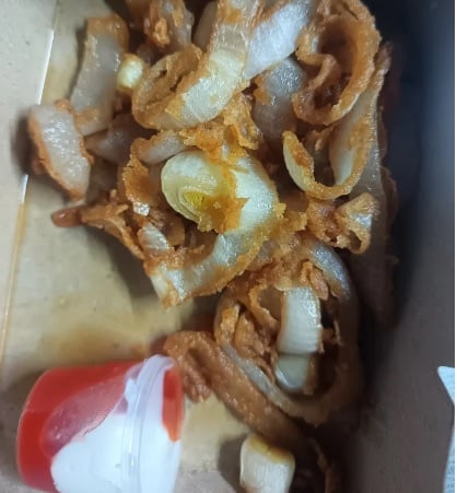 根据女子的帖文显示,她所购买的洋葱圈与一般餐馆售卖的酥脆金黄造型大相径庭。照片中的洋葱看起来只是经过简单油炸,表面空空如也,完全没有面糊裹粉,卖相令人瞠目结舌。