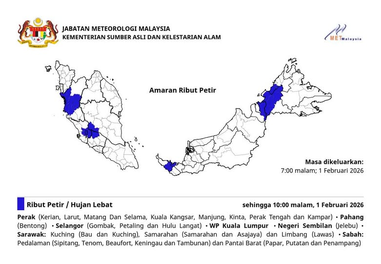 马来西亚气象局于今晚 7 时发布最新气象预警,半岛多个核心地带(包括吉隆坡与雪兰莪部分地区)及东马两州将迎来持续性的狂风暴雨,恶劣天气预计将延至今晚(2026年2月1日)10 时正