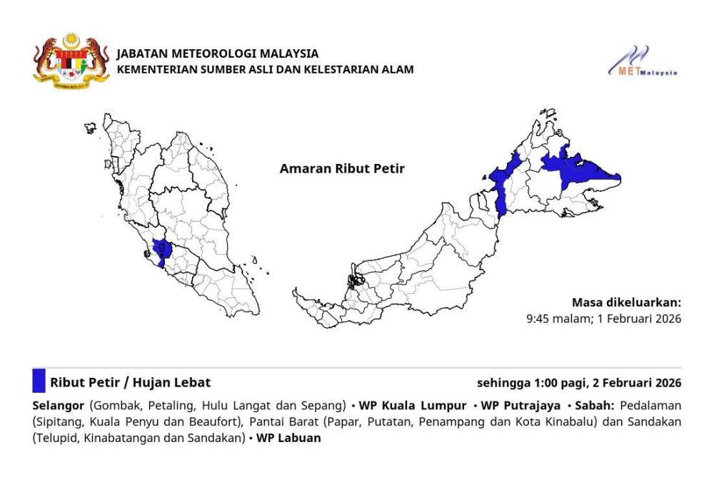 准备迎接一个潮湿的周一早晨!马来西亚气象局于今晚9时45分更新气象预警,由于雷雨云团持续活跃,半岛雪隆布地区及东马多地的恶劣天气将延长至明日(2月2日)凌晨 1 时正