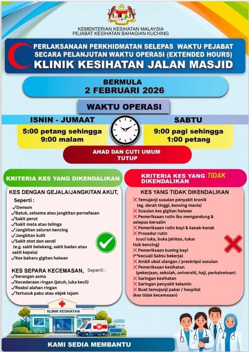 古晋卫生局宣布,位于清真寺路的健康诊所(Klinik Kesihatan Jalan Masjid)从2026年2月2日(今日)起,正式落实办公时间后的延长服务(Extended Hours)。