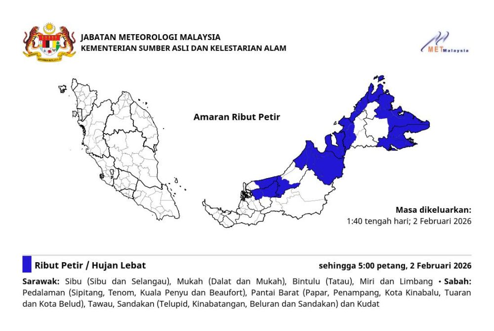 马来西亚气象局(MET Malaysia)于今日下午发布最新雷雨预警,砂拉越及沙巴多个地区预计将迎来强降雨、雷暴及狂风天气,恶劣天气料持续至今日傍晚 5 时正。