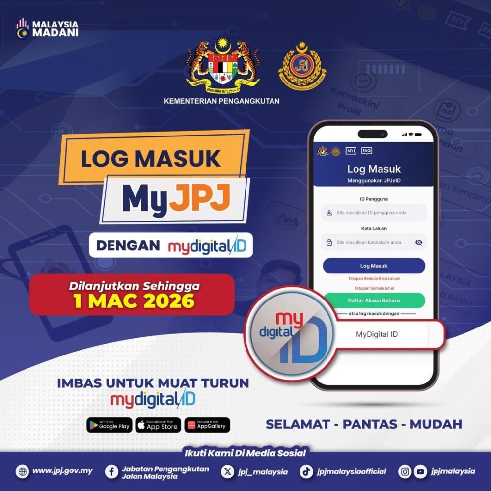 陆路交通局(JPJ)最新宣布,MyJPJ 应用程序强制使用 MyDigital ID 登录的措施将展延至 2026年3月1日 正式落实。这意味着用户还有一个月的时间进行注册与衔接,届时 MyDigital ID 将成为登录该 APP 的唯一身份验证方式。