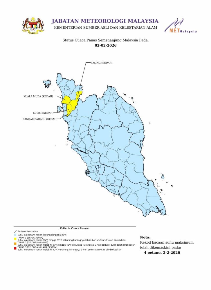 马来西亚气象局(MET Malaysia)今日下午发布最新酷热天气报告,北马吉打州(Kedah)共有 4 个地区正式进入一级(Level 1)黄色预警状态。民众受促在炎热午后减少户外活动,并时刻补充水分。