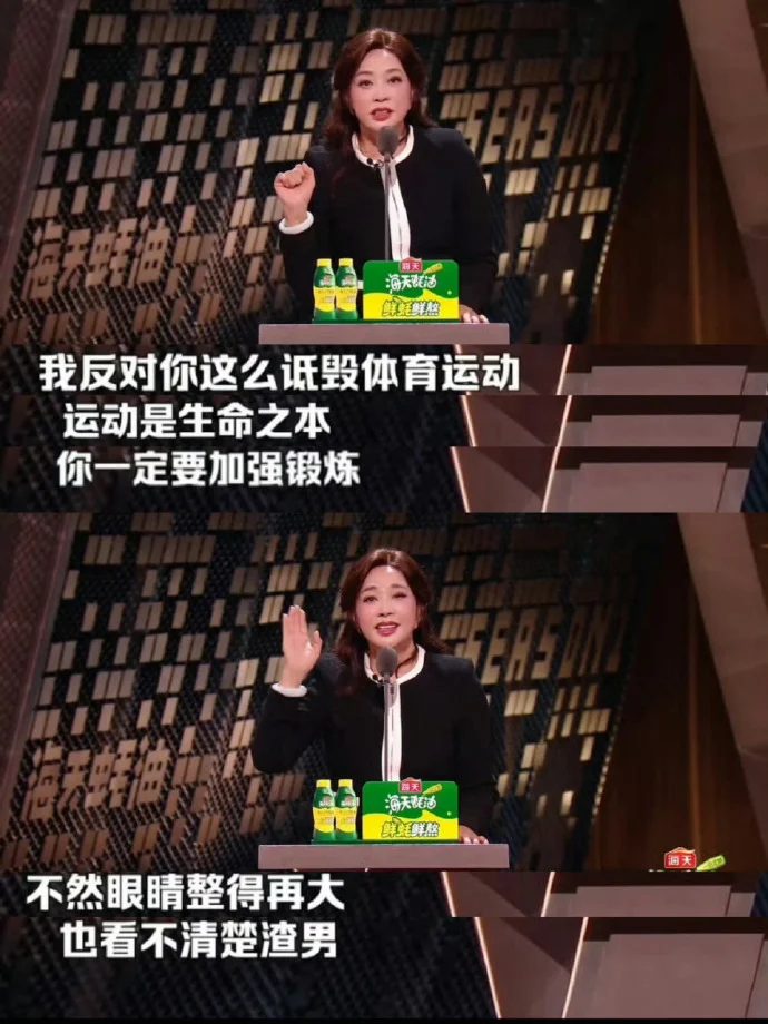 面对周扬青的调侃,刘晓庆犀利回击,强调“运动是生命之本”,并反驳道:“我反对你这么诋毁体育运动,你一定要加强锻炼。”她认为打羽毛球确实比整容更有用,更在最后抛出一句杀伤力极强的狠话:“不然眼睛整得再大,也看不清楚渣男。”这句暗讽周扬青昔日情史的直白发言瞬间逗笑全场,也将火药味推向最高点。