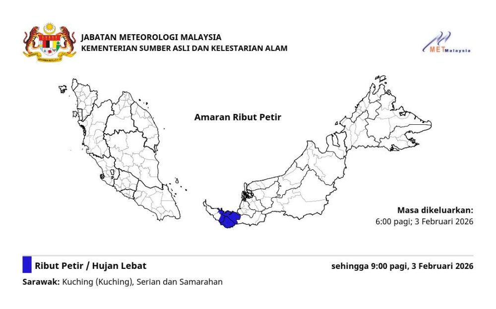 根据气象局通告,雷暴与豪雨警报涉及砂拉越古晋(Kuching)、西连(Serian)及三马拉汉(Samarahan),警报生效时间从今日清晨6时起,预计持续至上午9时。