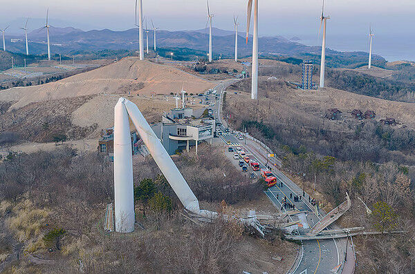 南韩庆尚北道盈德郡上演了惊魂一幕:一座运行中的巨型风力发电机在众目睽睽之下,因叶片突然撕裂导致重心失衡,整座高达80公尺的塔柱轰然折断,横切倒卧在马路中央!事发当时碎片如雨点般四散,所幸周边展馆正值休馆,路面车辆稀少,才让当地居民在死神指缝中捡回一命,未酿成惨重伤亡。