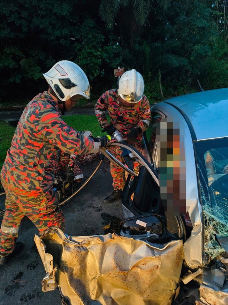 这起悲剧发生在清晨6时许,正是许多人准备开启一天忙碌生活的时刻。山打根消拯局在接获投报后,火速调派9名消拯员赶往仅3公里外的现场营救。当时,车内3人均被废铁般的车体死死夹困,动弹不得。消拯员被迫动用特殊救援工具,在一片刺耳的金属切割声中,争分夺秒地撬开车门。遗憾的是,坐在乘客席的51岁女死者已无生命迹象,医疗人员现场证实她已撒手人寰。
