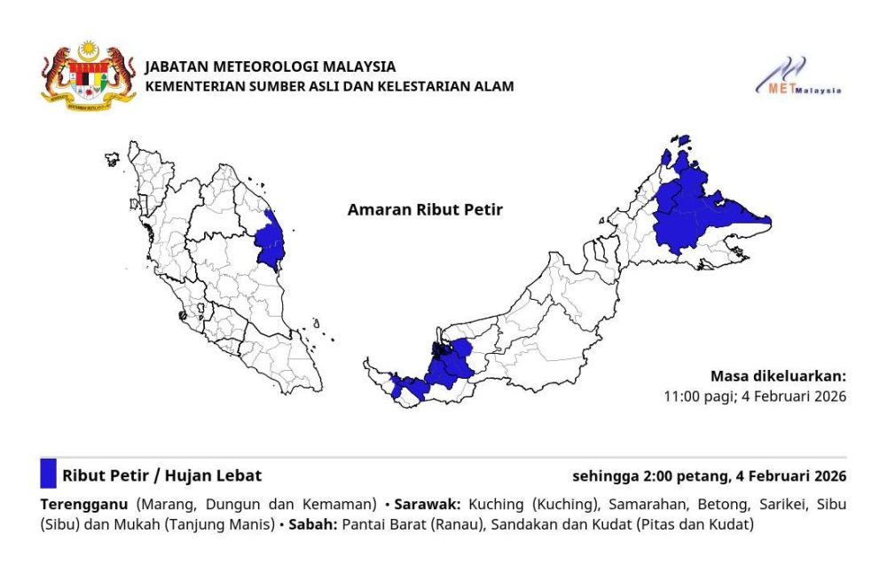 大马气象局今早11时发出最新紧急预警,强风雷雨阵线正横扫半岛东海岸及东马多个地区。由于雷暴云团移动迅速,登嘉楼、砂拉越及沙巴多个城镇预计将迎来每小时超过20毫米的强降雨,恶劣天气至少持续至今日(4日)下午2时。