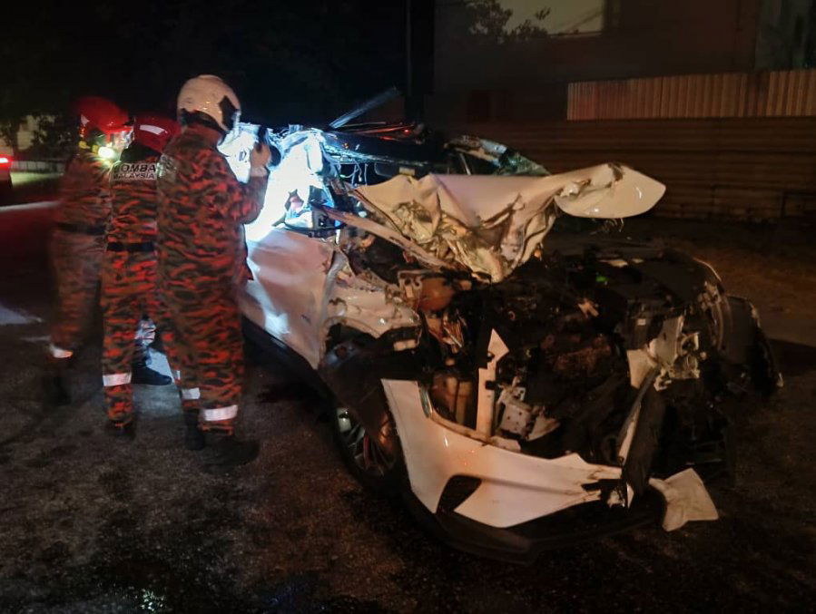 凌晨梦碎双溪罗甘!北海双溪罗甘工业区(Sg Lokan)周二凌晨上演一幕惊心动魄的夺命惨剧。一辆宝腾X50休旅车在夜幕下疾驰,不知何故竟一头猛撞前方货柜罗里的“钢铁尾部”,由于撞击力道极其惊人,整台休旅车车头近乎被压扁成废铁。41岁的华裔男司机骆嘉华在毫无预警下被钢架死死夹困,在方向盘与废铁之间痛苦挣扎,最终逃不过死神召唤,在消拯员救出前已魂断现场。