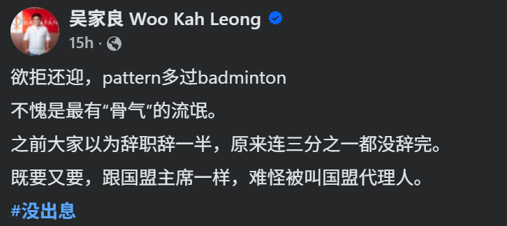 吴家良今日在面子书发布不点名贴文,语带讥讽地形容对方是在玩弄“欲拒还迎”的政治手段。他形容,原以为对方只是“辞一半”,没想到现在看来连“三分之一”都没辞成,行为举止与国盟领袖如出一辙,更讽刺阿克马是“国盟代理人”。