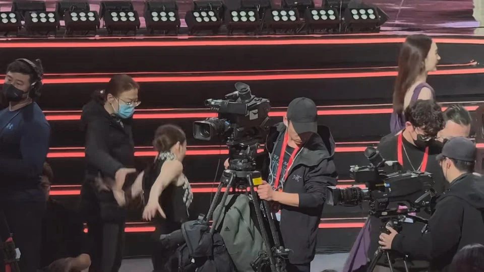 影片捕捉到了这惊魂一刻:佘诗曼当时已换上一袭高贵冷艳的黑色晚装,脚踩恨天高在台下优雅步行,岂料疑似因重心不稳,整个人瞬间“断电式”跌坐在地。虽然身旁工作人员第一时间伸手营救,但仍快不过重力。