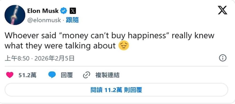 马斯克在发文中不仅认同“金钱买不到幸福”这句老话,甚至还配上了一个悲伤的表情符号,表现出一种“高处不胜寒”的落寞。根据最新数据显示,这位科技巨头的个人净资产已创下人类史上最高纪录,其财富不仅领先第二名富豪逾5780亿美元,甚至比全球排名第二至第五位富豪的总资产加起来还要多。