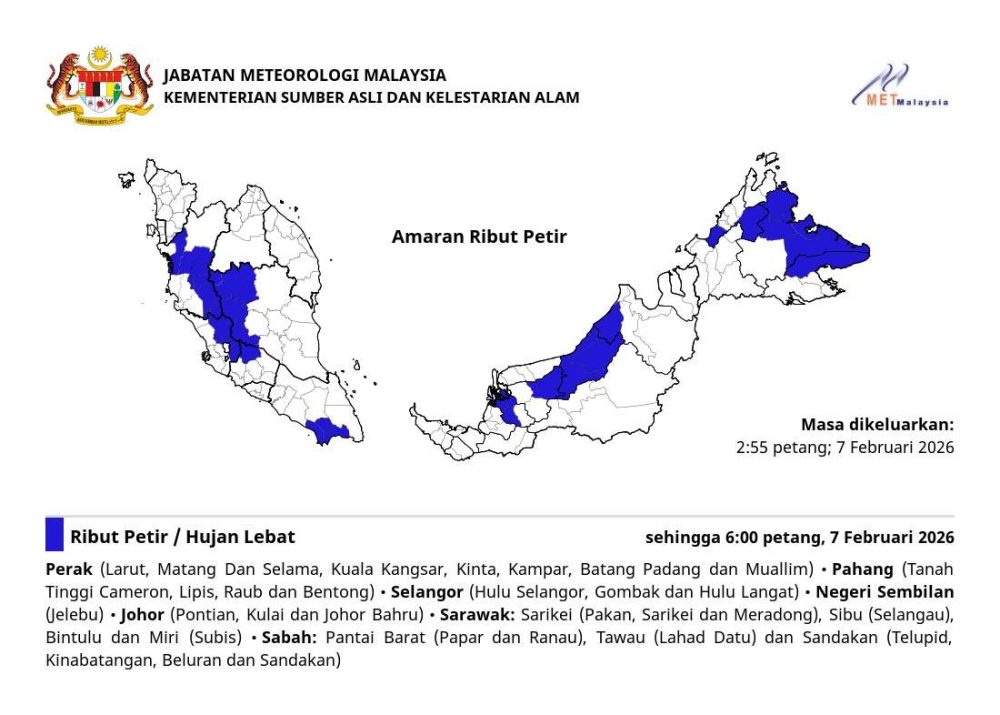 气象局紧急拉响黄色警报!马来西亚多地即刻起将陷入狂风暴雨的笼罩。根据气象局今日(2月7日)下午2时55分发布的最新预警,西马半岛多个州属、砂拉越及沙巴部分地区正面临雷暴与大雨侵袭,预计恶劣天气将持续至傍晚6时。